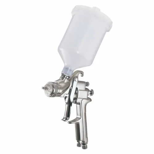 Conventional gravity feed spray gun, suitable for industrial purpose and car refinishing painting. Equipped with a 600c.c. gravity cup, a spanner, a cleaning brush and a paint filter.